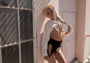 The air conditioning was out in Elsa Jean’s apartment, so the blonde hottie stepped out on the fire escape to get some fresh air and cool off. She was wearing just a thong-back bodysuit with a shirt over it, but the weather was so hot she knew right away she was wearing too much. Pulling her bodysuit down, she pinched her nipples and smiled then wiggled her hips and slid the rest of the way out of the bodysuit. This Playboy Bunny didn’t care if the neighbors saw her shaved pussy or perky tits, she needed to cool down! Tossing the shirt aside, she stood at the edge of the fire escape completely naked and looked down so she could wave at the people walking by. As the cool air hit her naked body and she finally started to cool down, the naked, hot model struck a fun pose and tossed her long, gorgeous blonde hair.