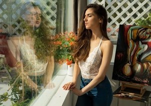 Karoline CC worked hard to get her back garden exactly how she wanted it. With some nice plants, a place to paint, and a place to layout in the sun, it is perfect. This afternoon the sexy Playboy Playmate has her paints out and is working on a new project. She likes how it is going but needs to take a break to let things dry. Ready to stretch out, the brunette babe takes her tight jeans off then sheds the lacy bodysuit she has on under it. Her tight, petite body looks amazing when she lays down on the sun bed. Rolling onto her back, she sticks her perky, small tits in the air before rolling back over onto all fours so she can crawl over to the other side of the garden, her cute ass sticking out and her tight, trimmed pussy getting wet.