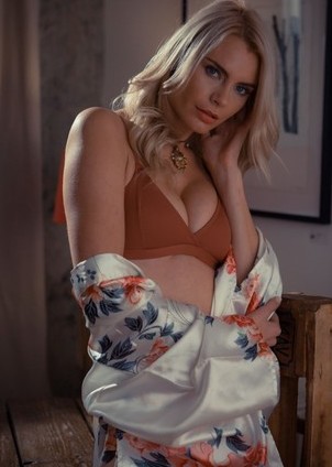 Miky Muse wakes up and heads down for her morning coffee. Wrapped in a silk robe, the blonde bombshell looks fantastic. She sits down at the table and lets the robe fall open, showing her fine, fit body in her bra and panties. The hot, Playboy Playmate takes the robe off and tosses it aside then she unhooks her bra, takes her perky tits out, and presses her arms against them. She stands, wiggles her curvy hips, and lets her panties slip down to the floor. Now naked, her pussy shaved into a little landing strip, the babe makes her way over to the table to sit and relax while she waits for the coffee to start. With the coffee about ready, she walks around the room in the nude, heading over to a window so she can get some fresh, morning air that makes her puffy nipples hard.