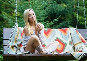 Blonde Playboy Bunny Zhenya Belaya had a big tree swing built in her backyard and couldn’t wait to give it a try once it was finished. Wearing just the onesie she had on inside, the fit, sexy model headed out, laid a blanket down on the swing and climbed in. She loved swinging so much she couldn’t take the smile off her beautiful face. As she swung, she started stripping the onesie off. With just the top down she ran part of the blanket across her small tits and got her nipples hard then she eased her way out of the outfit so she was completely naked and made herself comfortable. The soft blanket against her tight ass, shaved pussy, and amazing, fit body had her feeling a little naughty so as the swing moved back and forth, she moved her hands up and down on her fine body.