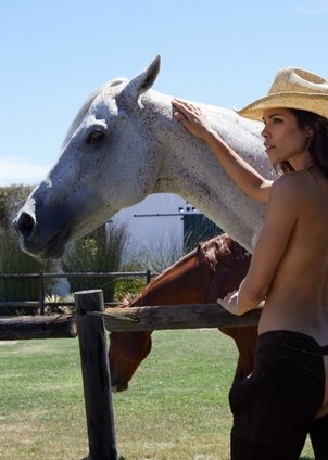 Katerina Giannoglou is a German hottie that loves getting naked for Playboy. Taking a photographer to her ranch, the country girl showed just how sexy being down on the farm can be. In the barn, the busty babe took her top off then sat on some hay while slithering out of her tight, jean shorts. She put on just her boots and cowboy hat then went outside and had some fun trying on some chaps then running around, feeding her horse, and exploring the nature around the ranch in the nude. She slipped on a pair of panties, the feel of the soft material making her shaved pussy wet, then she climbed on the horse and went for a ride, her amazing tits bouncing as the horse trotted along and this naked cowgirl had the best photo shoot of her life!