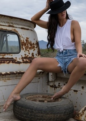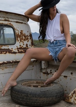 Carmen Nikole has a love for old trucks. The sexy Playboy Playmate is a country girl in her soul and loves spending time outside and in the wild. During a trip where she got into her old pickup truck and drove up to a spot where she had a great view in the high desert, the hottie took her tied up, sleeveless shirt off then slipped out of her jean shorts and panties. She kept her cowboy hat on as she walked around and checked out the area in the nude. The warm desert air blowing against her soft skin really turned her on. She went back to the truck, tried to start it, and realized she had a dead battery. After calling a friend for a jump start, she had some time to kill so the smoldering hot model laid a blanket down in the back of the truck and sprawled out to do a little nude sunbathing while she waited.