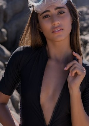 Snorkeling takes a turn for the very sexy when Playboy Bunny Katherinne Sofia heads to the beach. Always up for an adventure and a good time, she heads down to the beach in her bikini bottoms, wetsuit top, and with her mask to do a little snorkeling and exploring. She finds a good place to set up and decides to have a little fun on the beach before heading into the water. Unzipping and peeling off her tight wetsuit top, she shows she has nothing on under it so her small, perky tits pop out immediately. After playing in the sand a little, she slips her bottoms off so she can have fun in the sand, sun, and surf naked. Grabbing her mask and fins, the beauty heads to the water, does a little exploring and naked snorkeling then climbs out of the water and walks down the beach, shaved pussy and incredible, naked body out for anyone and everyone on the beach to see. This trip to the beach was fun, sexy, and filled with erotic adventure.